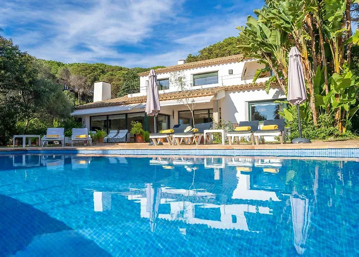 Villa Les Oliveres Piscina Privada Vistas Mar Aire Acondicionado Lloret de Mar med 3 sovrum erbjuder en privat pool och närhet till Playa de Treumal, som ligger ungefär 4 km bort. Villan med 3 badrum har en parkering och en uteplats med utsikt över trädgården.